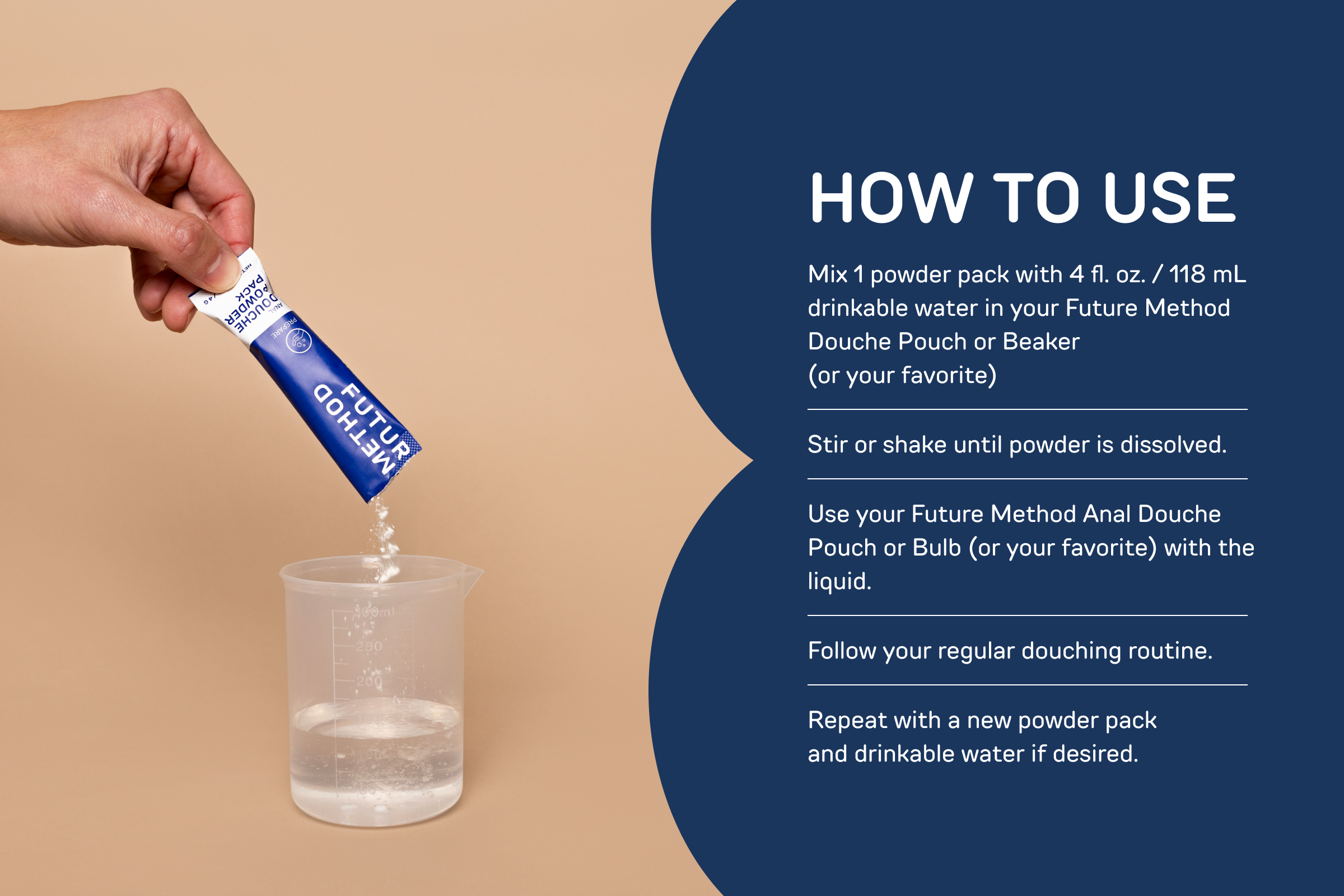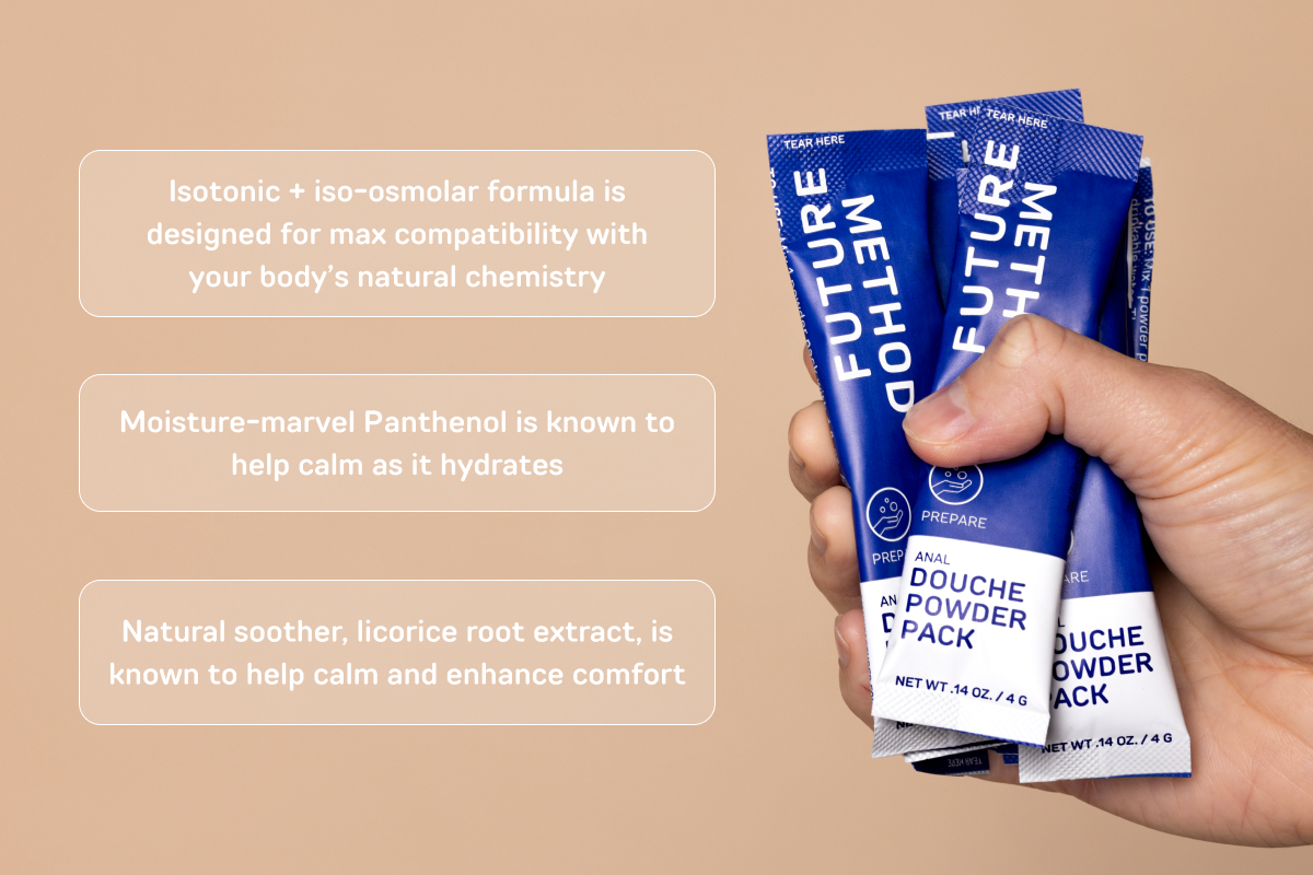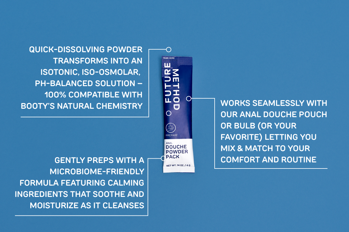 Your booty has a biome of healthy bacteria, just like your gut. Using water or store-bought enema solutions can disrupt your biome, and dehydrate and irritate the sensitive skin of your rectum. The Future Method anal douche powder packs are specially formulated by a doctor to be pH-balanced, isotonic, and iso-osmolar: meaning itâs balanced with your bodyâs chemistry and wonât disrupt a thing.