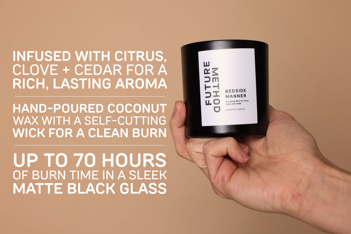 Hand-poured with our proprietary blend, this candle features all-natural coconut wax and premium ingredients for a clean, even burn. Infused with our signature Future Method scent, it’s finished with a self-cutting, metal-free cotton wick, and housed in sleek, matte black blown glass—elevating any space with style and sophistication.