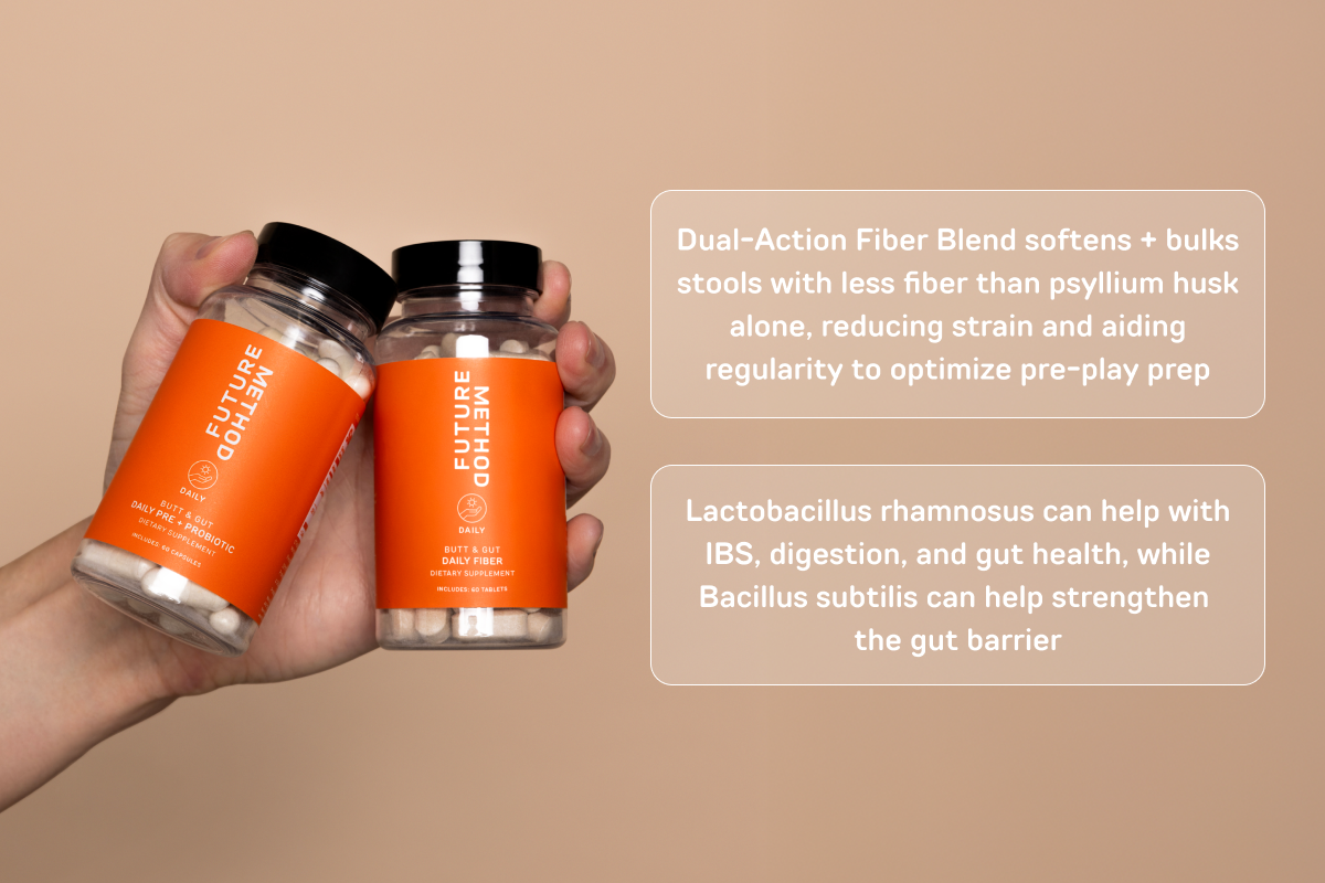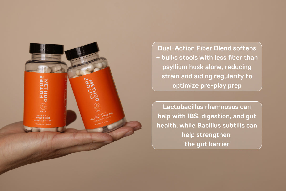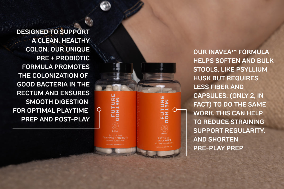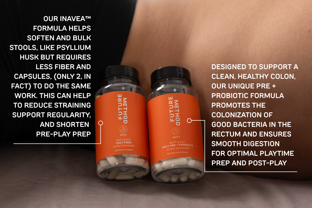 Support your gut and colon health with our Butt + Gut Daily Fiber and Pre & Probiotic bundle. Our Inavea™ fiber formula nourishes bifidobacteria, promotes fullness, and aids digestion while softening and bulking stools—like psyllium husk, but with fewer capsules (just two!). Paired with our Pre & Probiotic, which encourages good bacteria in the rectum and supports smooth digestion, this duo helps reduce straining, promote regularity, and keep your gut primed for both everyday wellness and optimal playtime prep.