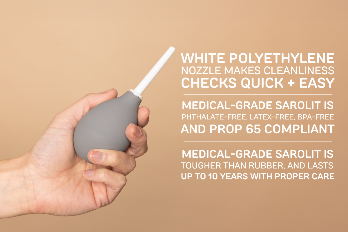 Bulb is made from medical-grade Sarolit™, while the nozzle is made from Polyethylene.